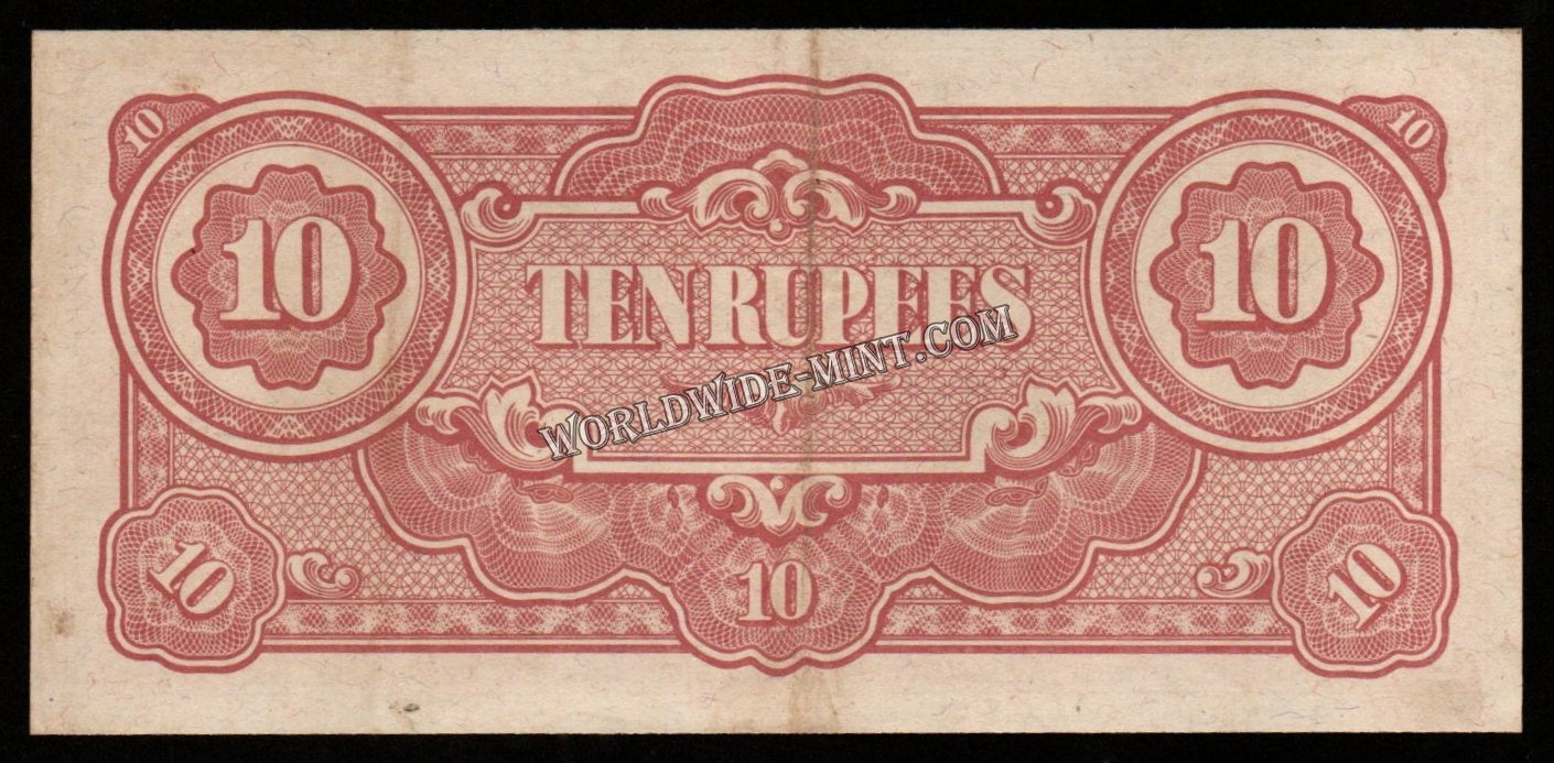 Burma (MYANMAR) WWII - JAPANESE OCCUPATION - 10 RUPEES 1942 - P#16b; Block letters: BA; No Watermark; silk threads; smooth paper; short line; BA 6.75 mm; 61-63 mm space between XF BANK NOTE #UCN947