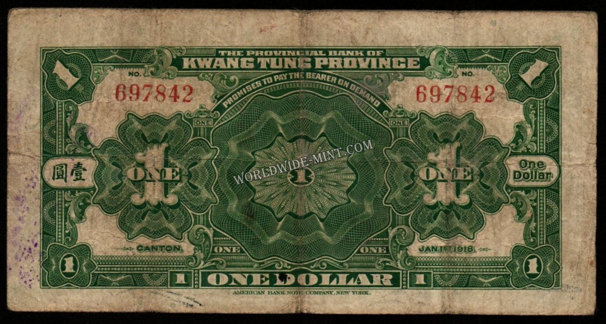 China (Kwangtung Province) 1 Dollar 1918 Kwangtung Provincial Fine Bank Note #UCN305