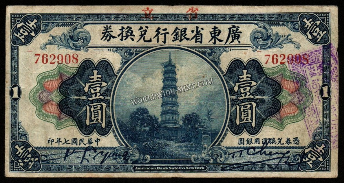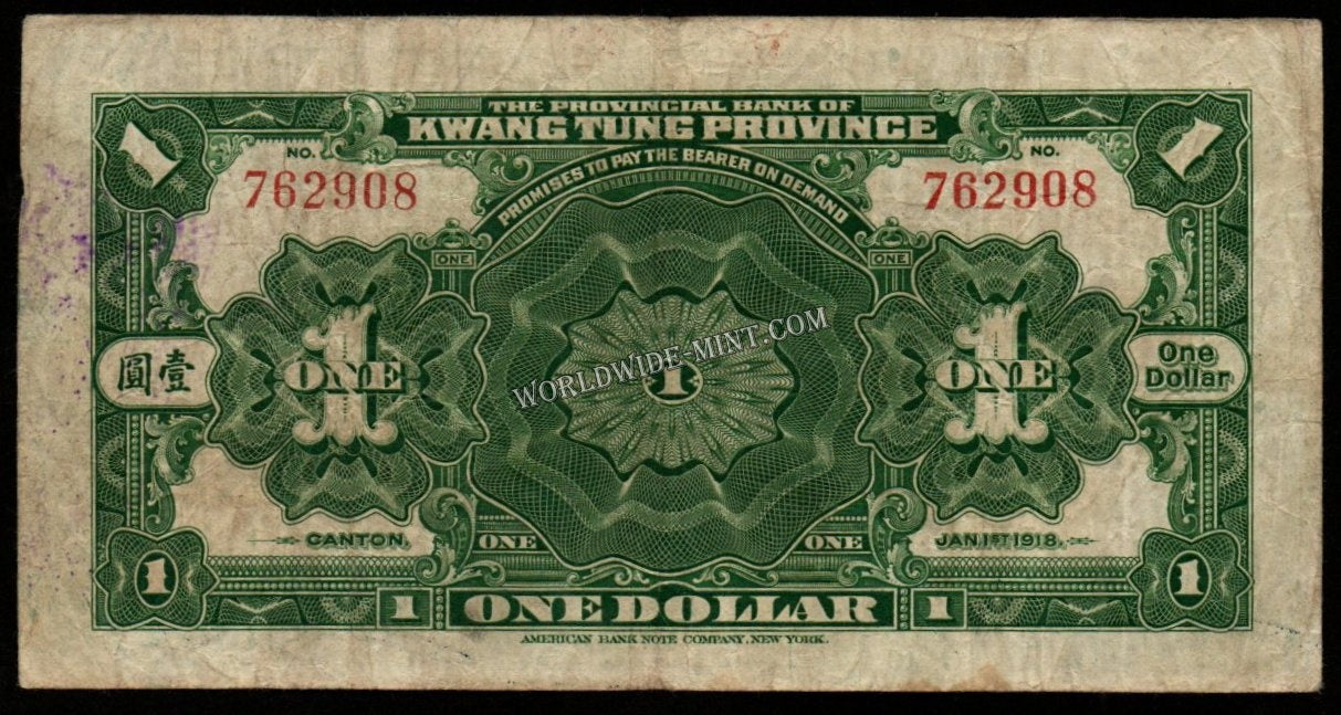 China (Kwangtung Province) 1 Dollar 1918 Kwangtung Provincial Fine Bank Note #UCN310