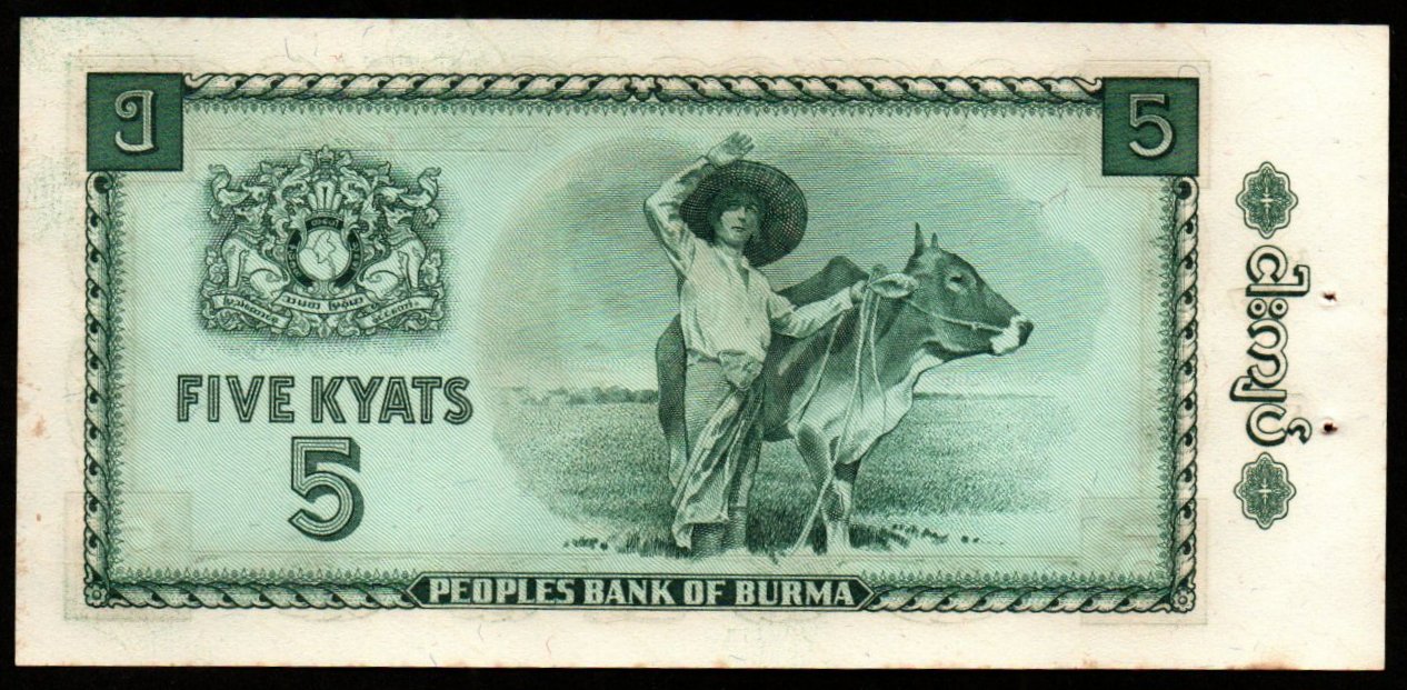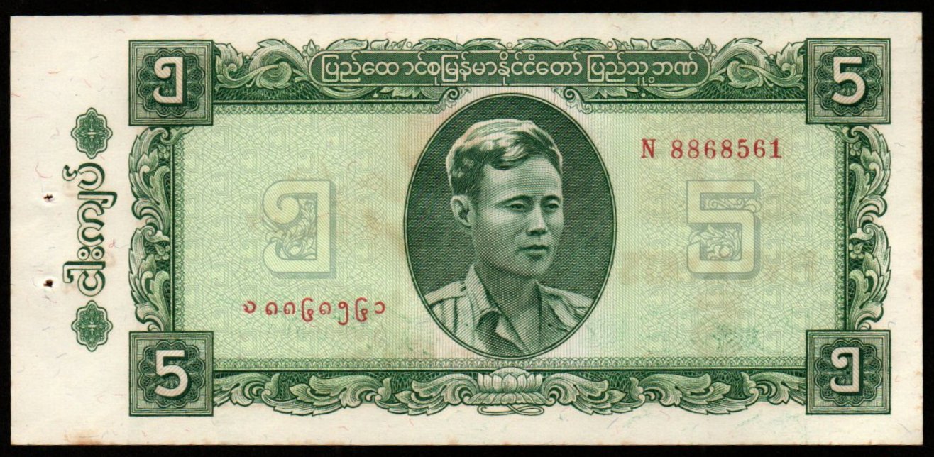 Myanmar 5 Kyats 1965 UNC Banknote with Mild Stains N#208258