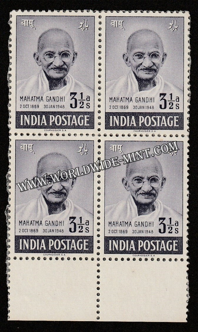 1948 Mahatma Gandhi-3 1/2 Anna Block of 4 Butter Paper Stuck