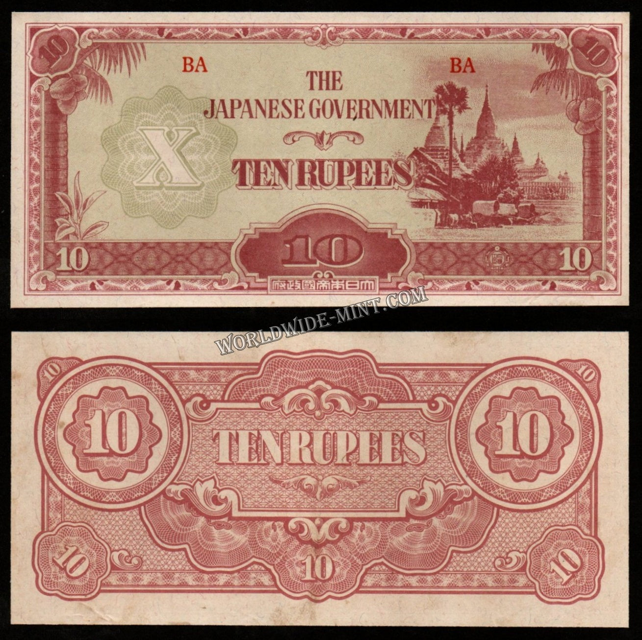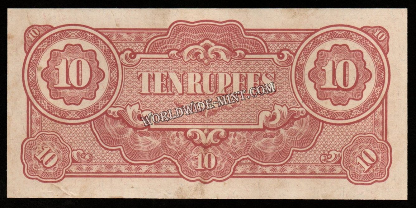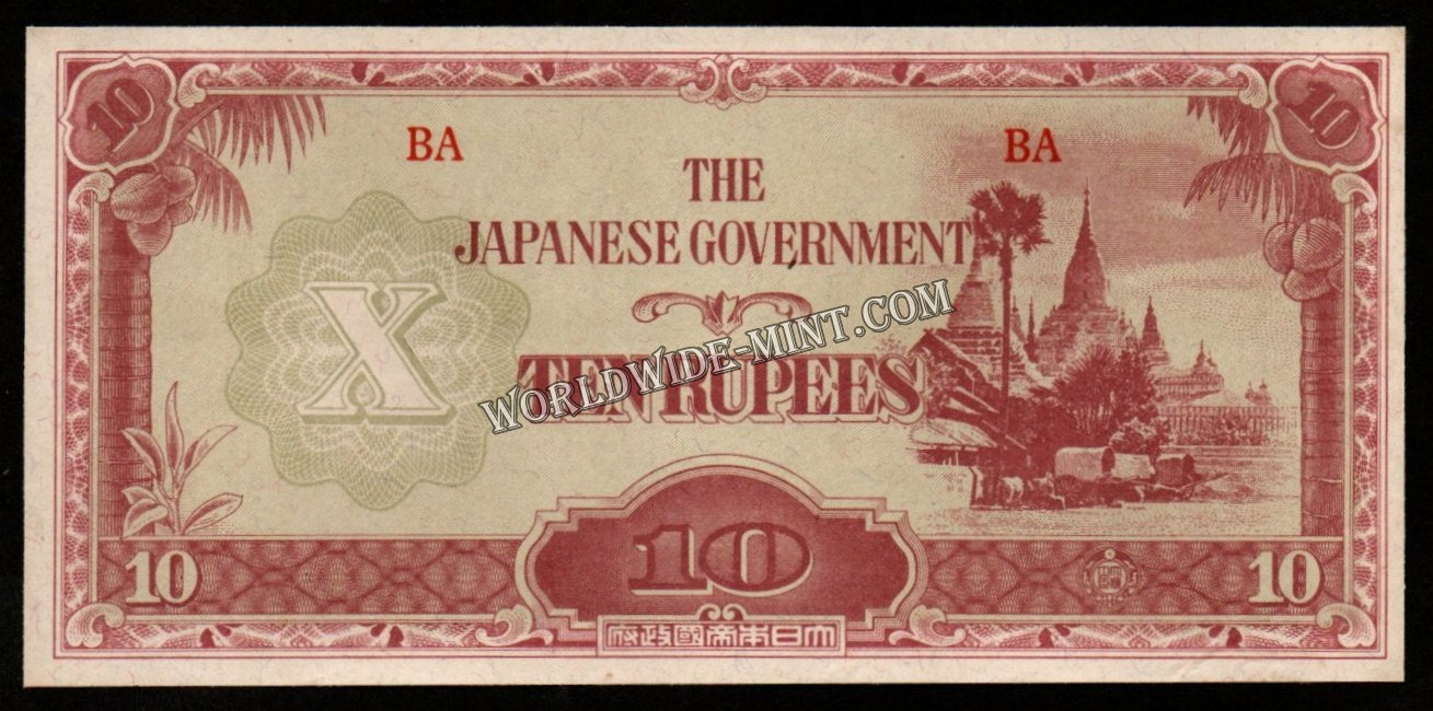 Burma (MYANMAR) WWII - JAPANESE OCCUPATION - 10 RUPEES 1942 - P#16b; Block letters: BA; No Watermark; silk threads; smooth paper; short line; BA 6.75 mm; 61-63 mm space between XF Banknote #UCN955