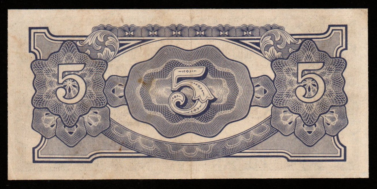 BURMA (MYANMAR) WWII - JAPANESE OCCUPATION - 5 Rupees 1942 - 1944 P#15b - Block letters BB XF Bank Note #UCN1000