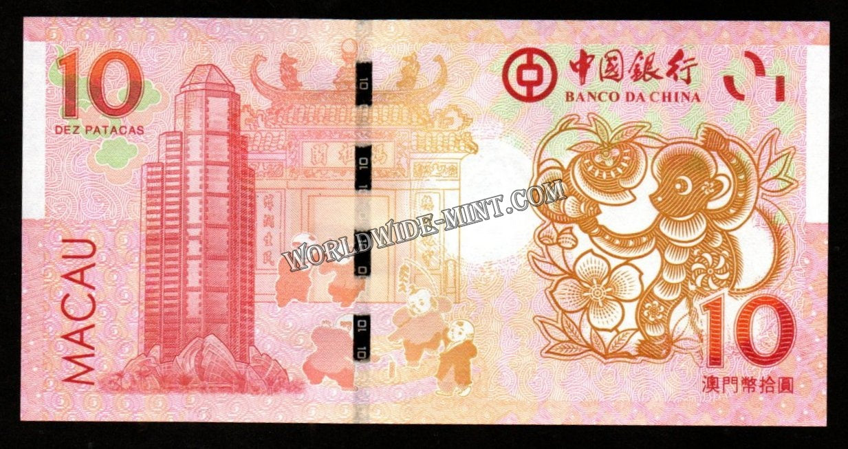Macau 10 Pataca 2011 Lunar Year of Monkey - Commemorative UNC Bank Note #CN1069