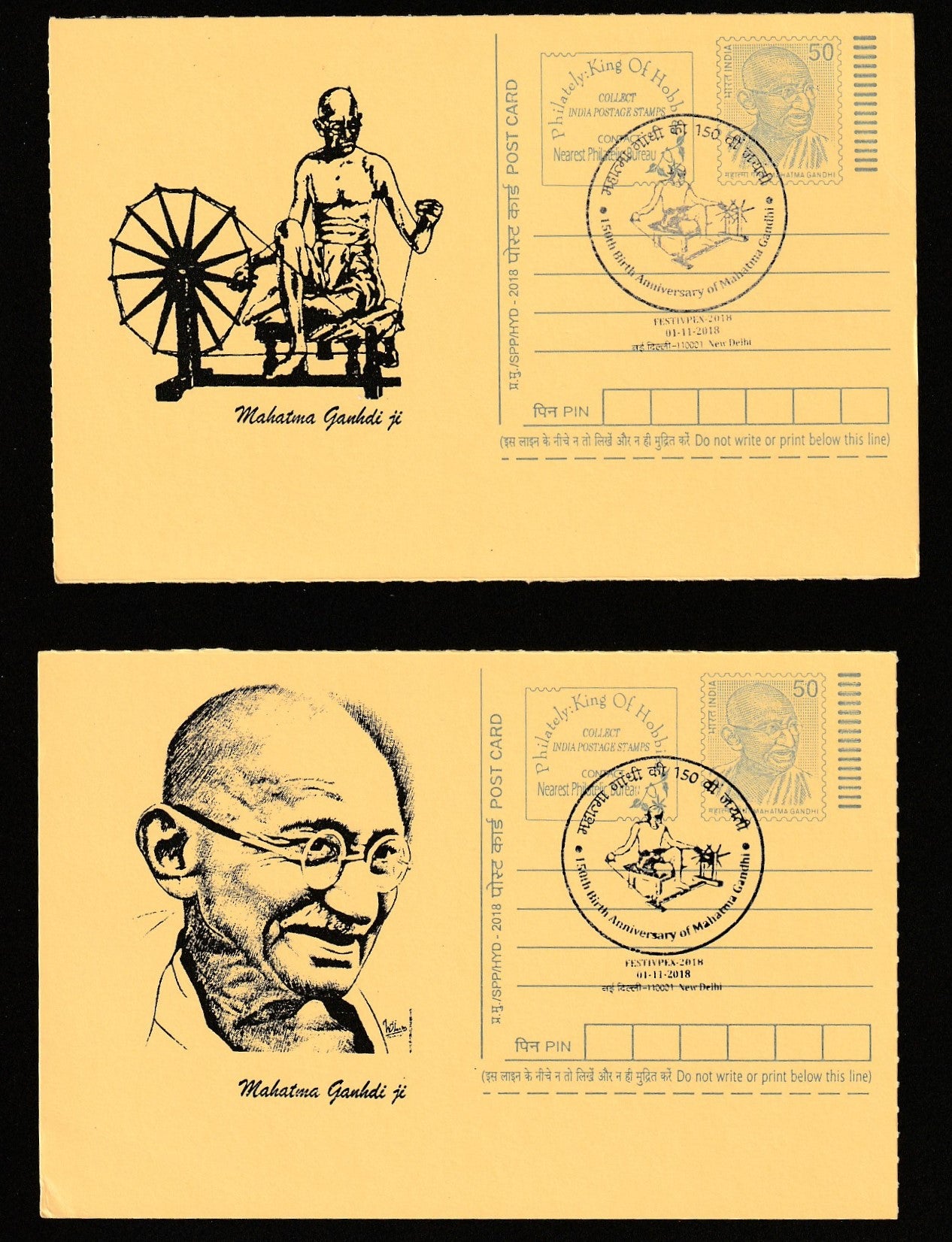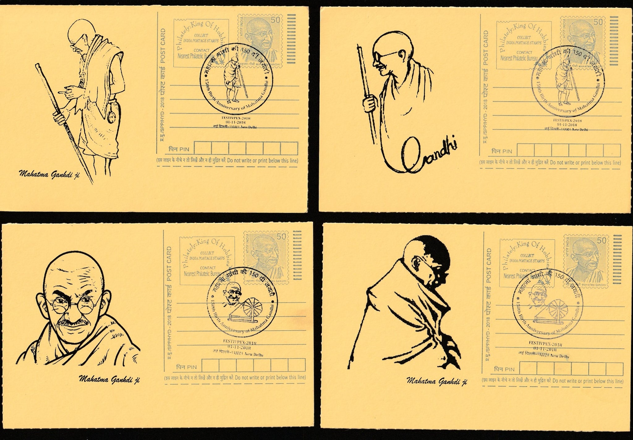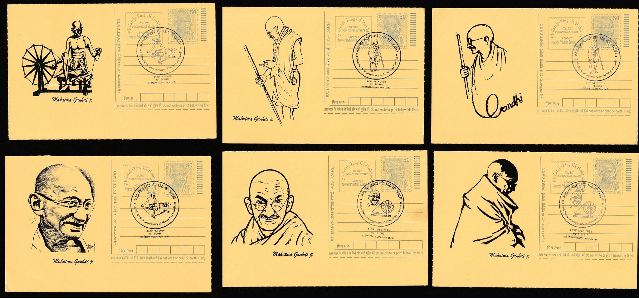2018 FESTIVPEX 150th Birth Anniversary of Mahatma Gandhi Set of 6 Cancelled Post Card #C-MPC-4