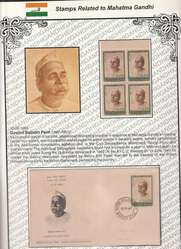 1965 Govind Ballabh Pant Block of 4 MNH & FDC Exhibit Sheet