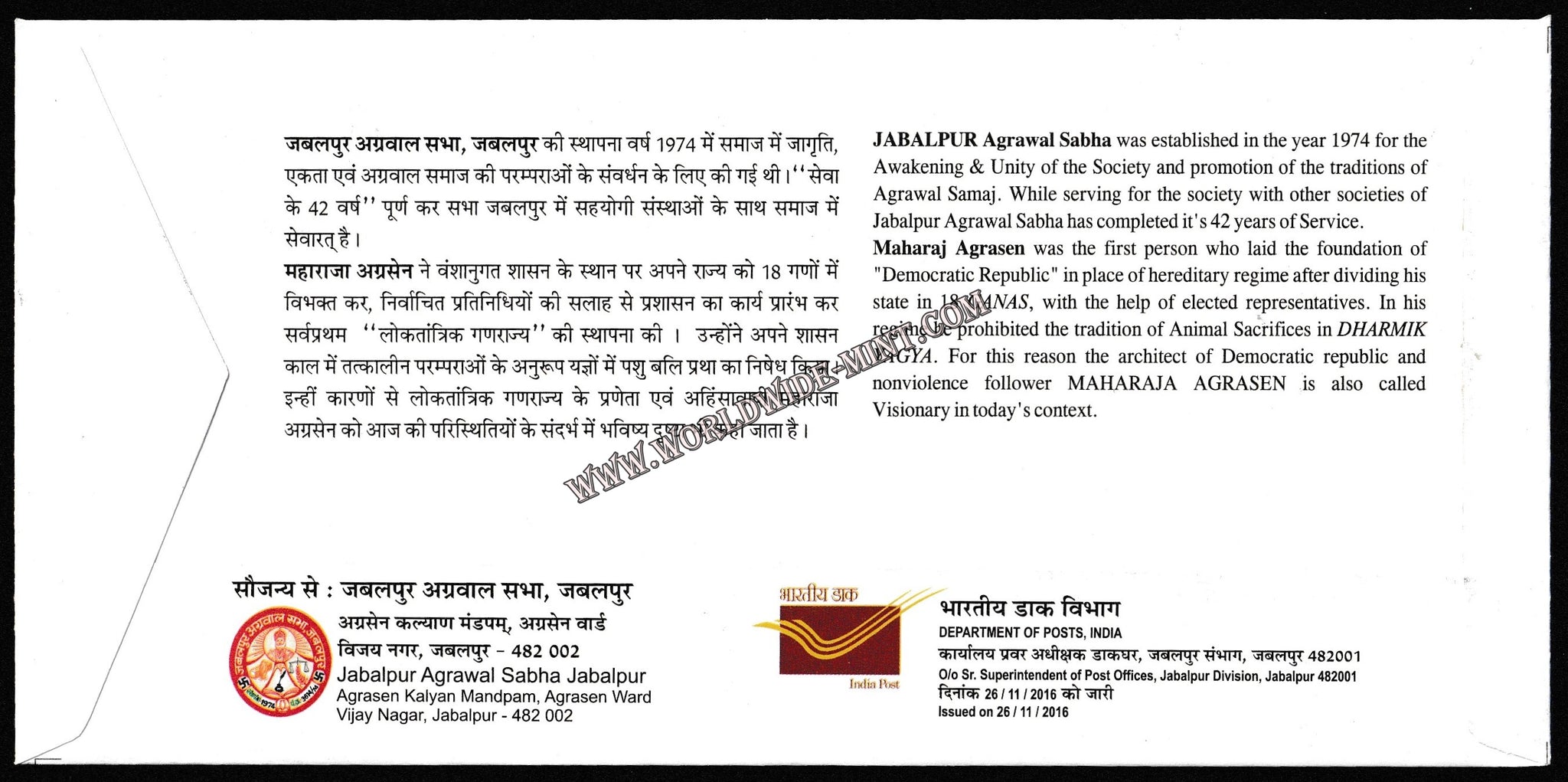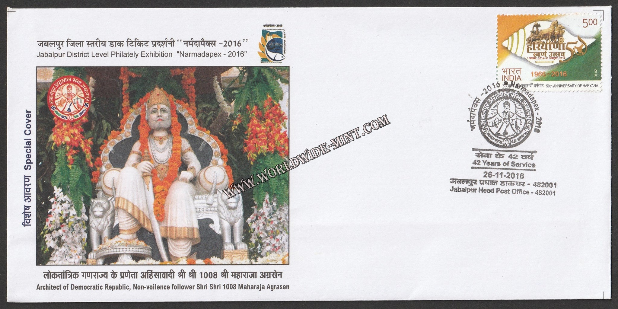 2016 NARMADAPEX Architect of Democratic Republic, Non-voilence follower Shri Shri 1008 Maharaja Agrasen Special Cover #SPL-334